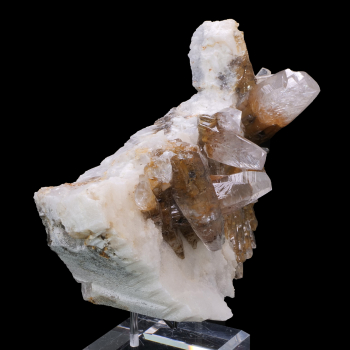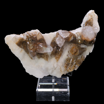 Impressive double generation calcite on matrix from the Xia Yang mine in China. We can see the crystallization steps easily on this part. The first generation consists of flat-ended hexagonal crystals of brown Calcite, followed by the second generation of colorless Calcite. The crystals are of...