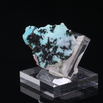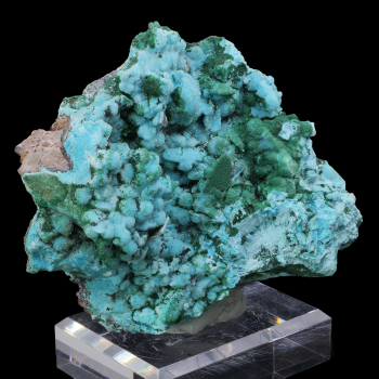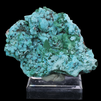Superb specimen having undergone two replacement phases: the Anhydrite was replaced by the Malachite, then the Malachite by the Chrysocolle. The surface is encrusted with colorless crystals of Quartz that offer an unprecedented shine to the piece. Malachite has settled on some crystals that...