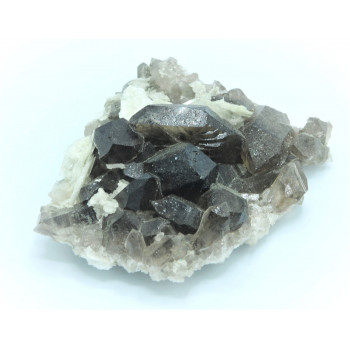Small plate having several spikes of smoked quartz associated with gwindel, white calcite blades and tiny fluorines pink.8 x 7 x 3 cm0067-CD