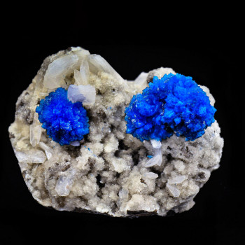 Beautiful cavansite associated with crystals of Stilbite. Extra quality, glossy, large crystals, intense color, nothing to do with what is usually offered on the web! Diameter of 2.2cm and 1.5cm crystals5.5 x 4.5 cmReference : 0175