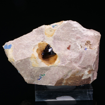 Piece associating, on a bed of chrysocolla, brilliant malachite and a partial covering of heterogenite.This sample comes from the Etoile mine, Lubumbashi, Haut-Katanga, Congo.It measures 7.3 cm long, 4.7 cm wide and 4.2 cm at the thickest.Its weight is 166 grams (with base).Reference:...