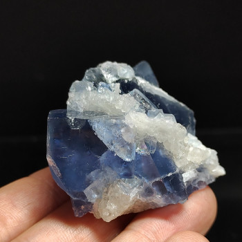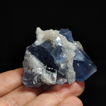piece of fluorite of a deep blue that comes from the marsanges mine, from the blue crazy pocket. The color is due to a large dark blue phantom on the periphery of the crystals. The general condition is correct. The 2 main cubes of 2.5cm are separated by a quartz blade.French minerals: Marsanges...