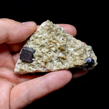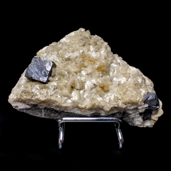 Old piece showing a cube of galena resting in a crystallization of beige dolomite. A second cleaved galena crystal is found at the bottom of the sample.It comes from the Joplin lead deposits in Missouri, USA.This mineral measures 7 cm wide by 4.7 cm high and 1.9 cm thick.Its weight is 74...