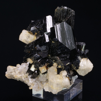 Group of biterminated Schorl crystals with two types of endings associated with well-formed colorless Goshenite crystals. Beautiful color contrast and beautiful shine for this piece.6,80 x 5,90 x 6,70 cmReference : 3432