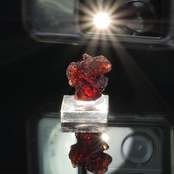 Fantastic Spessartine ultra gem from the famous locality of Navegadora in Brazil. The video is a must-see! There you will see the specimen with and without backlight. Without, we can see the striations on the entire piece typical of the locality, as well as the intense red color. With, the color...