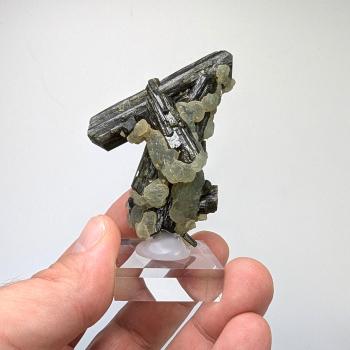 Nice presentation for this piece featuring an intertwining of epidote crystals and prehnite balls.It comes from Diakon, Bafoulabé Cercle, Kayes, Mali.This mineral measures 5 cm high by 4.6 cm wide (size of the largest double-terminated epidote crystal) and 3.5 cm at its thickest.Its weight is 42...