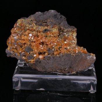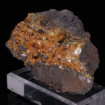 Specimen forming a geode inside which is a multitude of lustrous crystals of Wulfenite very well formed with intense orange color. This piece is sold with its custom-made base, engraved in the material.10,90 x 8,20 x 6 cmReference : 2831