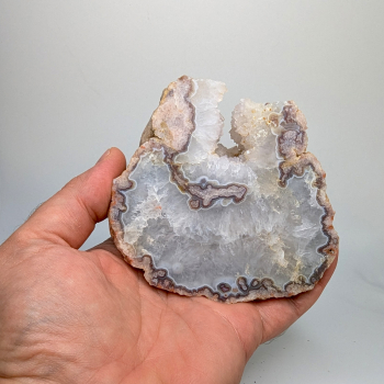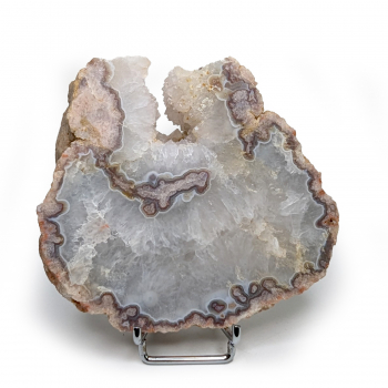 Chalcedony slice with a solid quartz core and a sawn geode of crystallized quartz.This piece comes from Bruère-Allichamps in Cher in France.It measures 9.6 cm long by 8.7 cm wide and 2.3 cm thick.Its weight is 298 grams.Additional photos and order online on the DGminéraux...