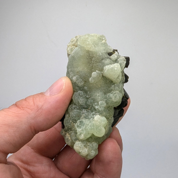 Piece showing an intertwining of epidote crystals covered with apple green prehnite.It comes from Diakon, Bafoulabé Cercle, Kayes, Mali.This mineral measures 6.5 cm long by 5 cm wide and 3.3 cm at its thickest.Its weight is 118 grams.Additional photos and order online on the DGminéraux...