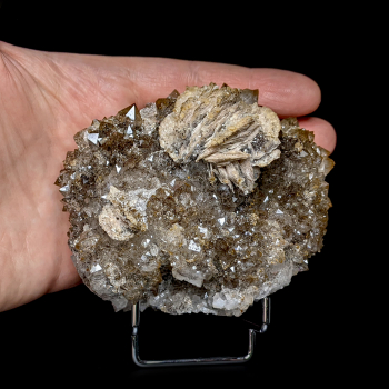 Shiny quartz hedgehog with crystals rich in inclusions (probably goethite), surmounted by a barite tassel.Piece from Aouli, Mibladen, Province of Midelt, Region of Drâa-Tafilalet, Morocco.It measures 8.9 cm wide by 7.6 cm thick and 6 cm wide.Its weight is 503 grams.Reference: 0751Additional...