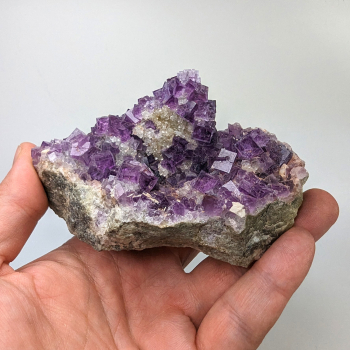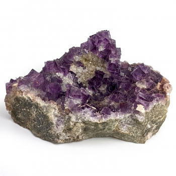 Crystallization of fluorite on quartz and traces of barite. The purple crystals are intense in color, shiny and bear well-marked growth ghosts.It comes from the Berbès sector in northern Spain.This mineral aesthetic measures 10.8 cm long by 7.6 cm wide and 5.8 cm thick.Its weight is 397...
