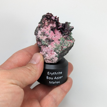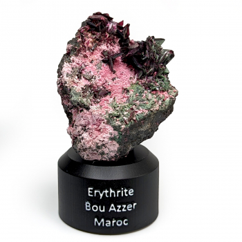 Long sample with bright calcite crystals on matrix bearing dark green mottramite spheres.Specimen from the Tsumeb mine, Oshikoto Region, Namibia.It measures 13 cm long by 5.1 cm wide and 5 cm thick.Its weight is 383 grams.Additional photos and order online on the DGmineraux...