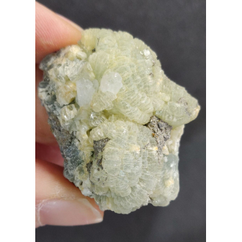 Prehnite, Quartz Imilchil MarocBeautiful pompoms with typical color, with quartz. There's a deposit of what may be marcassite.