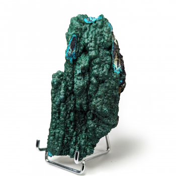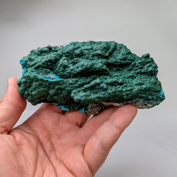 This lovely specimen shows finely crystalline, shiny malachite, with some areas of chrysocolla.This sample comes from the Etoile mine, Lubumbashi, Haut-Katanga, Congo.It measures 11.7 cm long, 6.3 cm wide and 3.5 cm at its thickest.Its weight is 187 grams.Additional photos and online ordering on...
