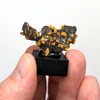 Sample of romanechite forming like a black coral covered with a yellow ferric oxide (goethite?).It comes from Veszprém, Veszprém county, Hungary.This specimen measures 3.4 cm wide by 1.9 cm wide and 2.2 cm thick.(Measures outside the base)Additional photos and online ordering on the DGminéraux...