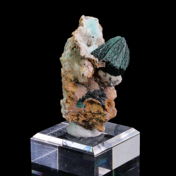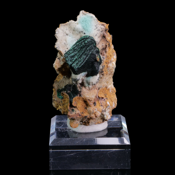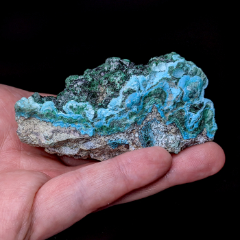 Piece associating, on a bed of chrysocolla, brilliant malachite and a partial covering of heterogenite.This sample comes from the Etoile mine, Lubumbashi, Haut-Katanga, Congo.It measures 7.3 cm long, 4.7 cm wide and 4.2 cm at the thickest.Its weight is 166 grams (with base).Reference:...