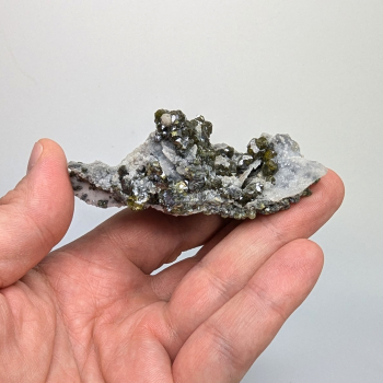 Piece bearing on gangue crystals of cleophane, variety of green sphalerite, very shiny.It comes from the mining sector of Madan, province of Smolyan, Bulgaria.This sample measures 8.1 cm wide by 4.5 cm high and 2.9 cm thick.Its weight is 72 grams.Additional photos and order online on the...