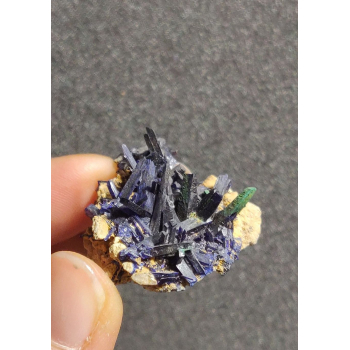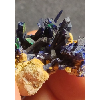 Azurite, Malachite Kerrouchen MaroccoVery thin cristals, some are terminated, some are partially pseudomorphed with malachite.