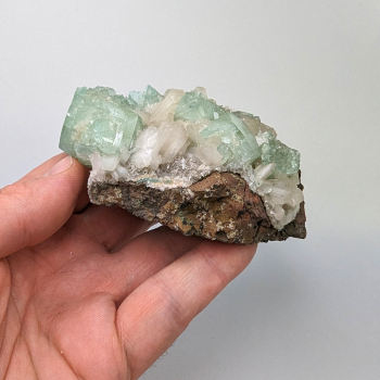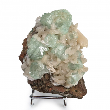 Interesting piece combining white stilbite and partially crystallized green apophyllite crystals.It comes from Maharashtra in India.This sample measures 10 cm long by 6.9 cm wide and 4.3 cm at its thickest.Its weight is 273 grams.Additional photos and online ordering on the DGminéraux...