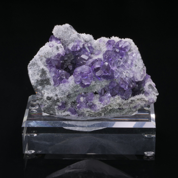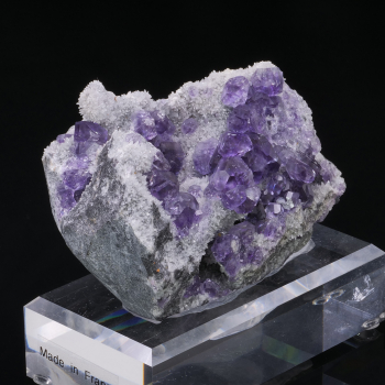 Multiple perfectly formed crystals of violet Fluorite gemstones and clear on Quartz bed that bring a beautiful shine. This specimen comes from the Xia Yang mine in China and is sold with its custom engraved base by us that allows it to hold optimally without glue or paste.9,30 x 7,60 x 5,40...