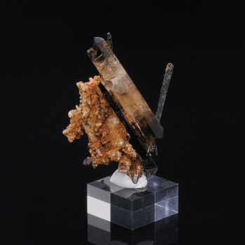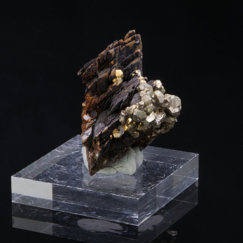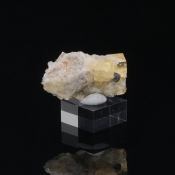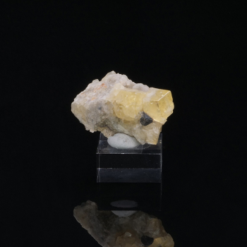 Anthracite Galena crystal surrounded by lustrous yellow Fluorite cubes. The color is intense, good quality for this miniature from Giromagny in France.3,70 x 2,60 x 1,60 cmReference : 3908