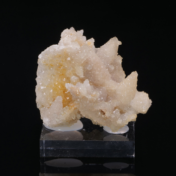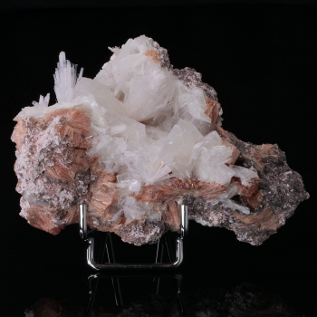 Superb association from the Wessels mine in South Africa. There are acicular crystals of salmon orange Inesite on all sides of the coin, with transparent white Natrolite crystals in the form of long sticks, very beautiful crystals, then Hydroxylapophyllite in the form of large white transparent...