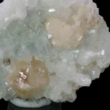 Pastel coloured specimen from the Xianghualing mine in China. It features glazed brown Scheelite crystals that strongly govern the UV to become glacier blue, with Dolomite crystals that form like flowers, all on pastel green Fluorite. Beautiful shine for this specimen.15,80 x 10,70 x 5,30...