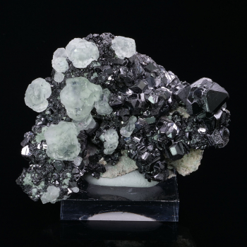 Superb contrast between green water fluorite and black metallic galena. Many Fluorite crystals scattered on their matrix of Galena, everything is perfectly crystallized. Specimen of collection, very rare to find.9,70 x 7,40 x 6 cmReference : 3346