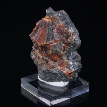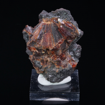 Sheaf of red Rhodochrosite crystals contrasting with the black matrix. Very beautiful crystallization atypical for the locality.7,70 x 6,20 x 3,80 cmReference : 3349