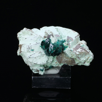 Beautiful and stocky crystals of intense green Dioptase on Plankite covered Quartz. Beautiful palette of green for this specimen from Kaokoland in Namibia.6 x 3,90 x 4,40 cmReference : 3370