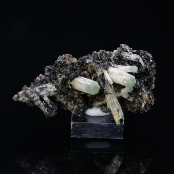 Group of biterminated Schorl crystals with two types of endings associated with well-formed colorless Goshenite crystals. Beautiful color contrast and beautiful shine for this piece.6,80 x 5,90 x 6,70 cmReference : 3432