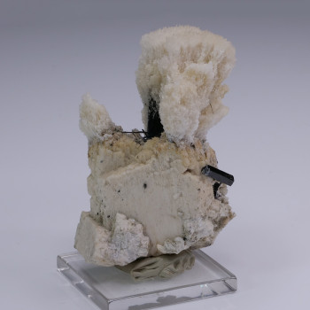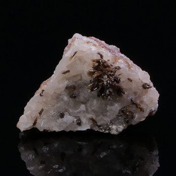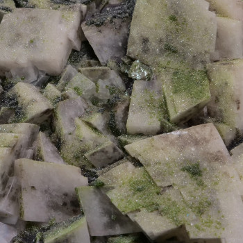 DIOPTASE, GOETHITE and MALACHITE on CALCITE - Tsumeb Mine, Tsumeb, Oshikoto, Namibia