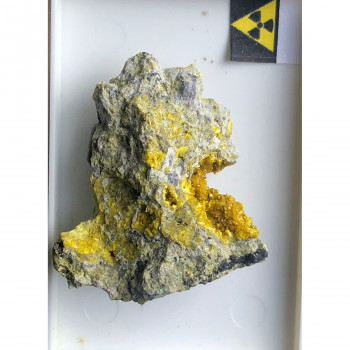 Shinkolbwe mine, Kambove, Katanga, D.R. of Congo. Specimen 3 x 3 x 1 cm with a geode covered with yellow microcrystals of uranophane, a calcium urano-hydroxy-silicate. Radioactive mineral Reference : 00239