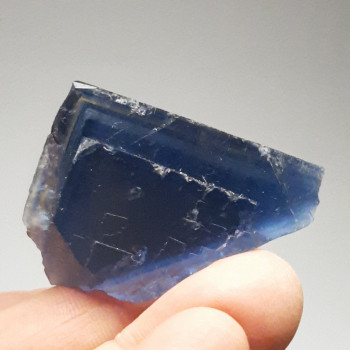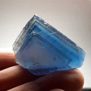 Intense blue fluorite crystal due to multiple growth zones. The crystal has a scalloped side. the heart of the crystal is yellow. There is a nice truncation on the top of the crystal. the ghosts are very nice and the overall color is not too dark. the surface appearance is satin.4.5 * 3 * 2.5cm...