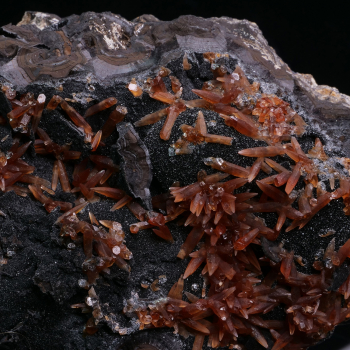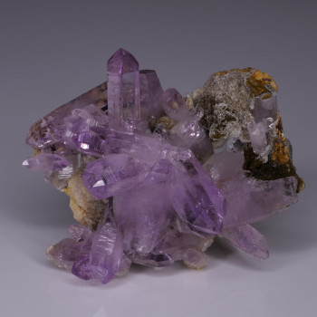 Small set of quartz crystals partially covered with iron oxide associated with small spheres of malachite. 3 x 1,4 x 1,3 cm. Reference : 2832-LM2T