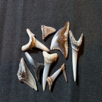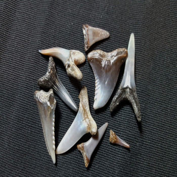 Lot of 9 shark teeth from the Faluns of Savigné sur Lathan, Touraine. (Dimension of the largest 2.8 cm)2,8 cm.Reference : 0068-RuFo