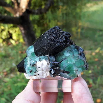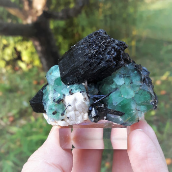 Beautiful combination of fluorite and black tourmaline, to note the presence of a small crystal of colorless aquamarine.6 x 4,4 x 4 cmReference : 0278