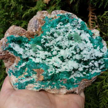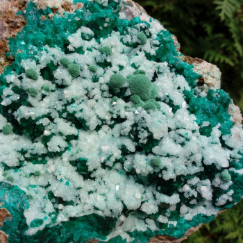 Crystals Dioptase partially covered Smithsonite is white, a few small rhombohedral Calcite, and decorated with Malachite balls. Superb and very original, excellent condition! 1516 g.15 x 13 x 7,5 cmReference : 0109