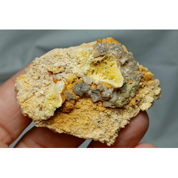 Very original small piece with yellow mimetite, cerussite and a light dusting of duftite, from Tsumeb, Namibia,6,2 cm.Reference : 0352