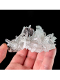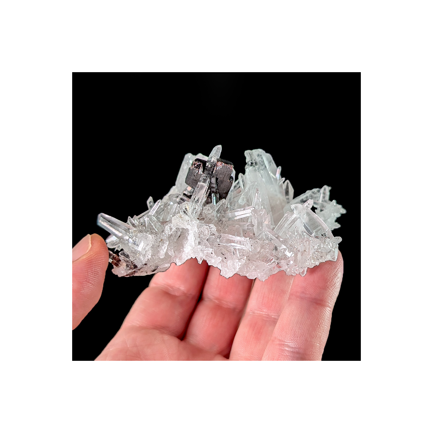 A beautiful free-floating quartz crystal, featuring a hubnerite crystal on one face and a pink fluorite crystal on the other.