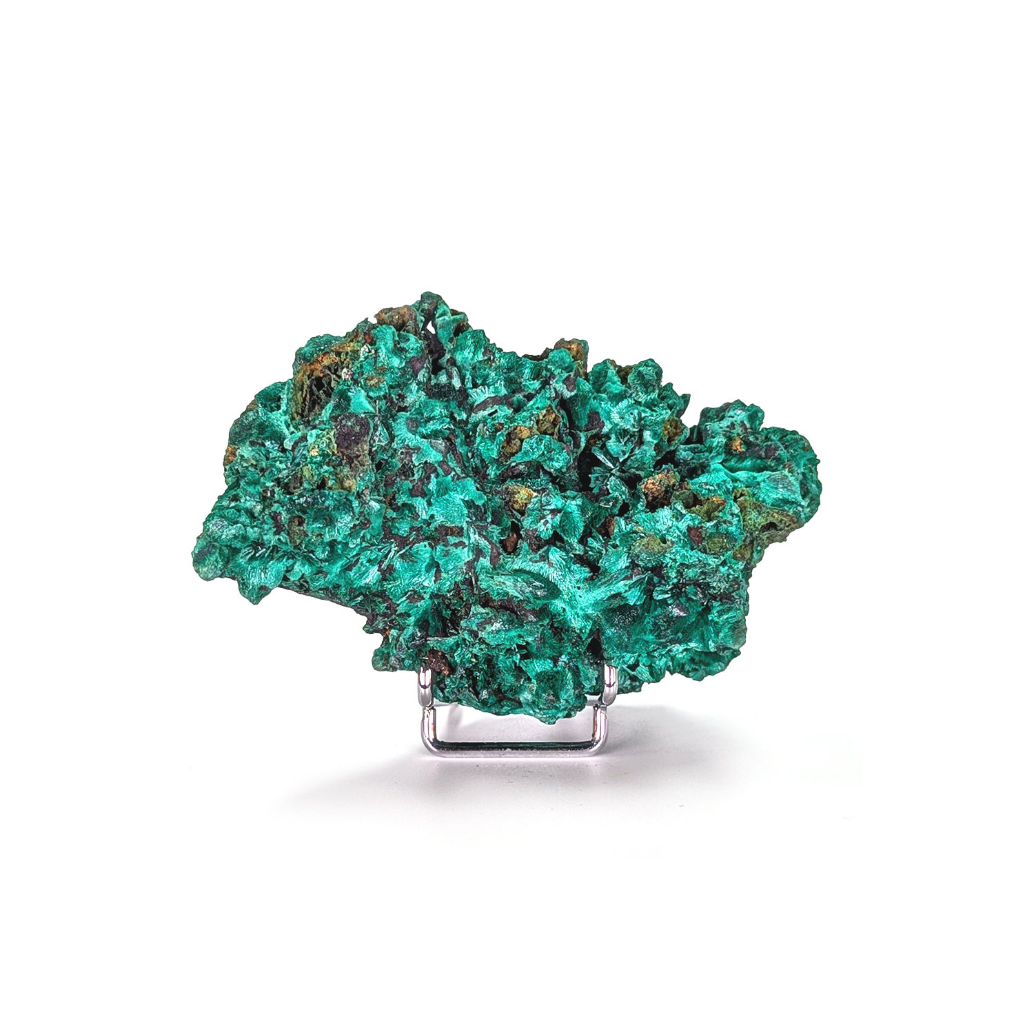 A piece of fibrous malachite with a beautiful, shiny color, crystallized all around.