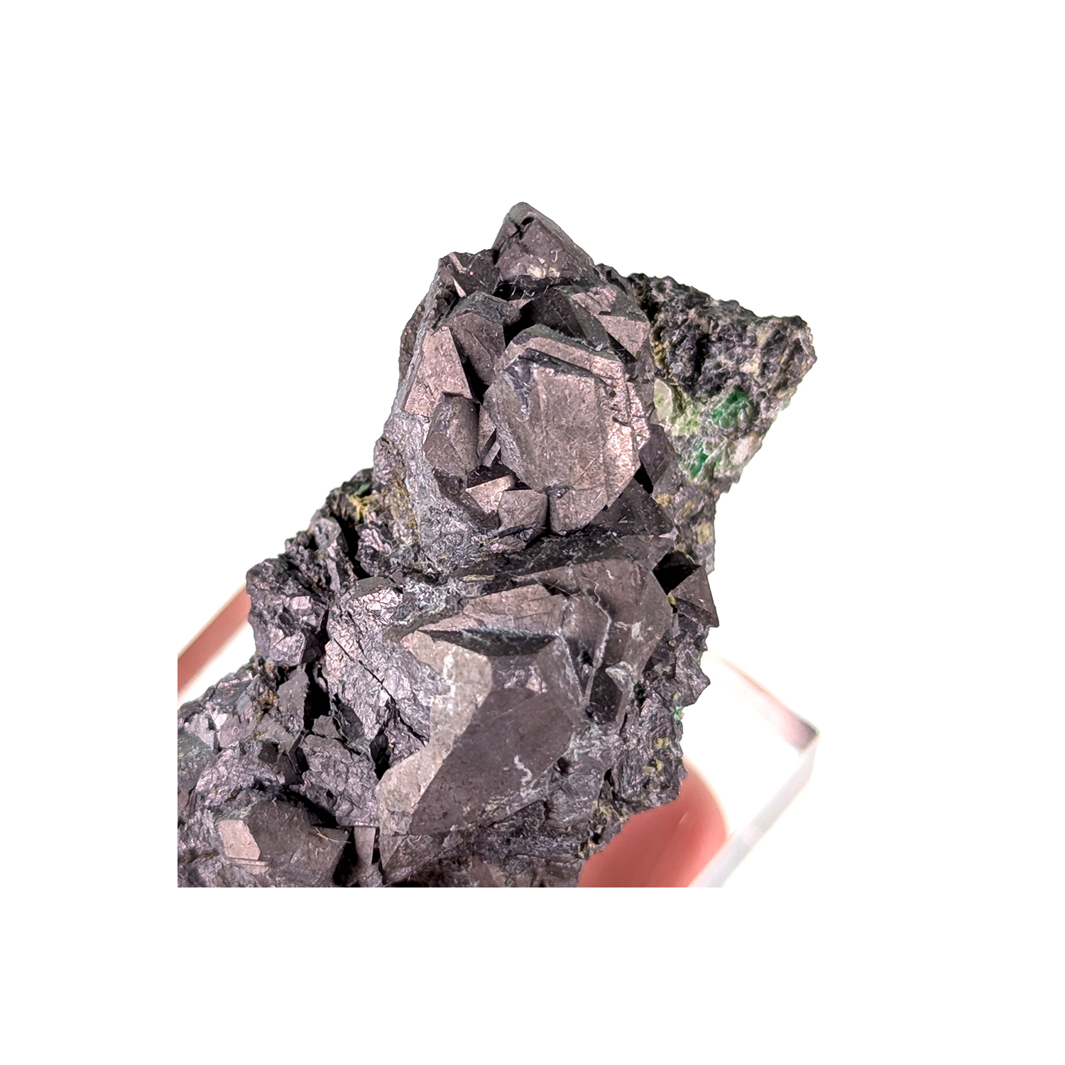 Octahedral gersdorffite crystals on rough gersdorffite, with minor green annabergite.