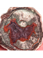 A polished, cut-in-half lithophyse nodule with a beautiful red and green pattern.