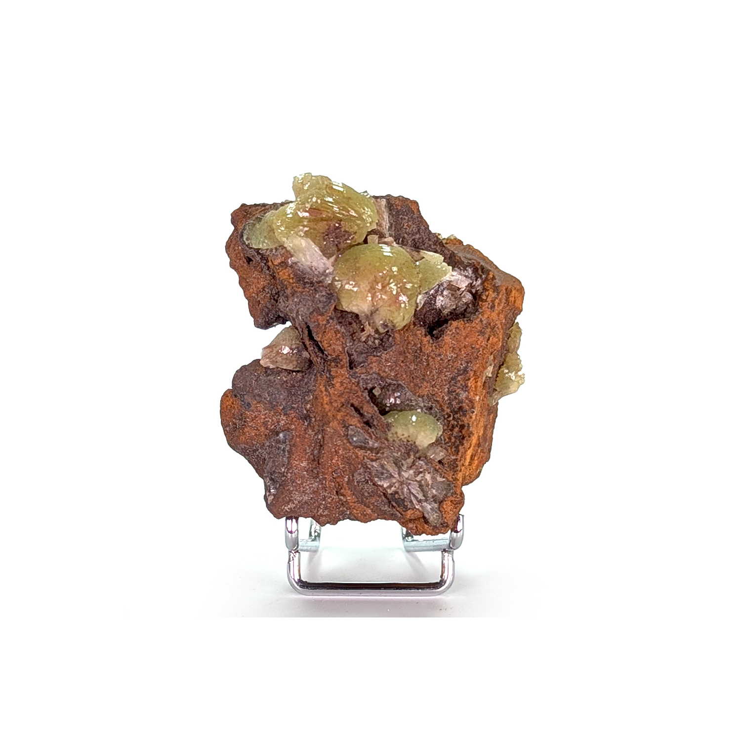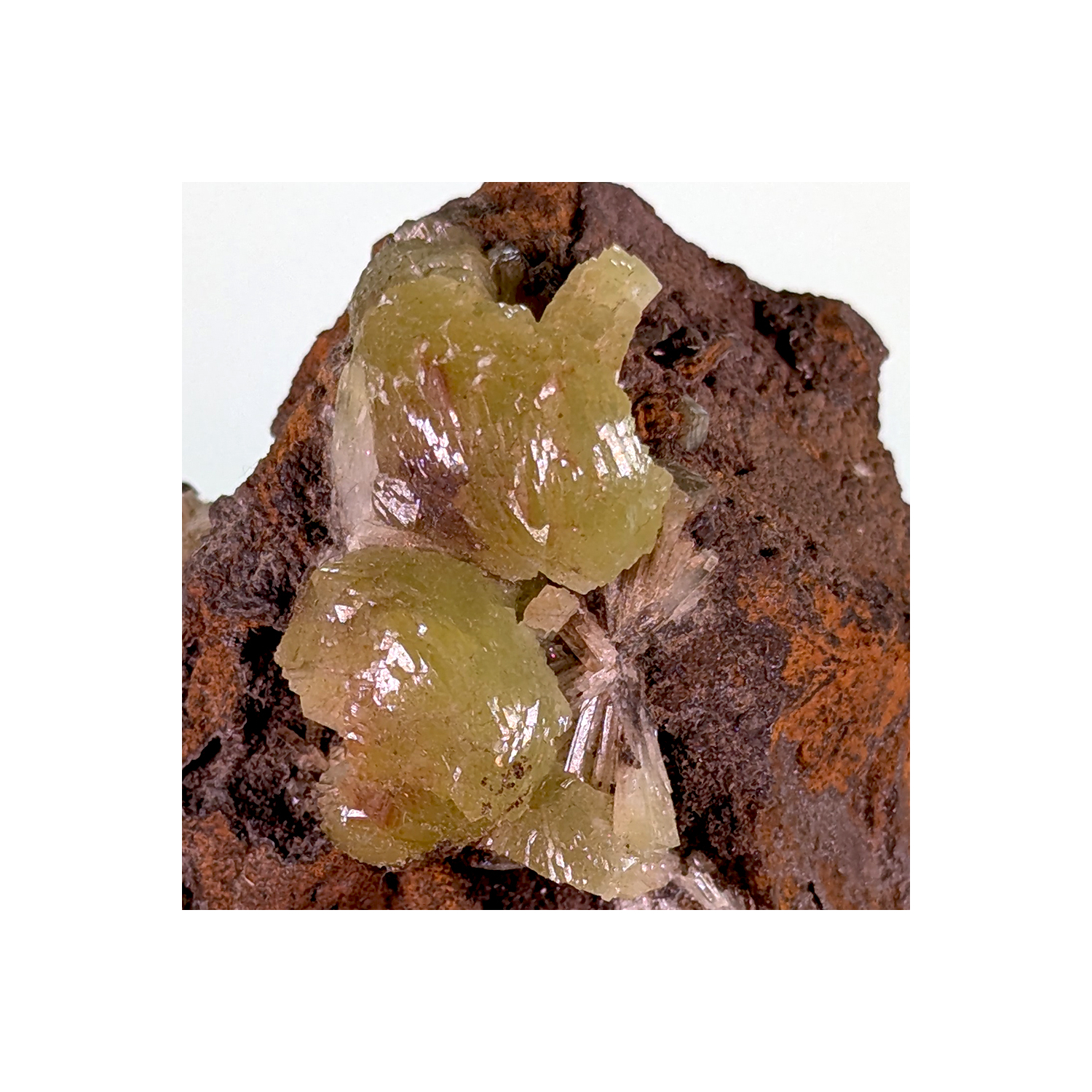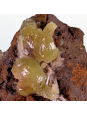 Yellow-green adamite on a limonite matrix, with zones of crystallization around the edge of the piece.