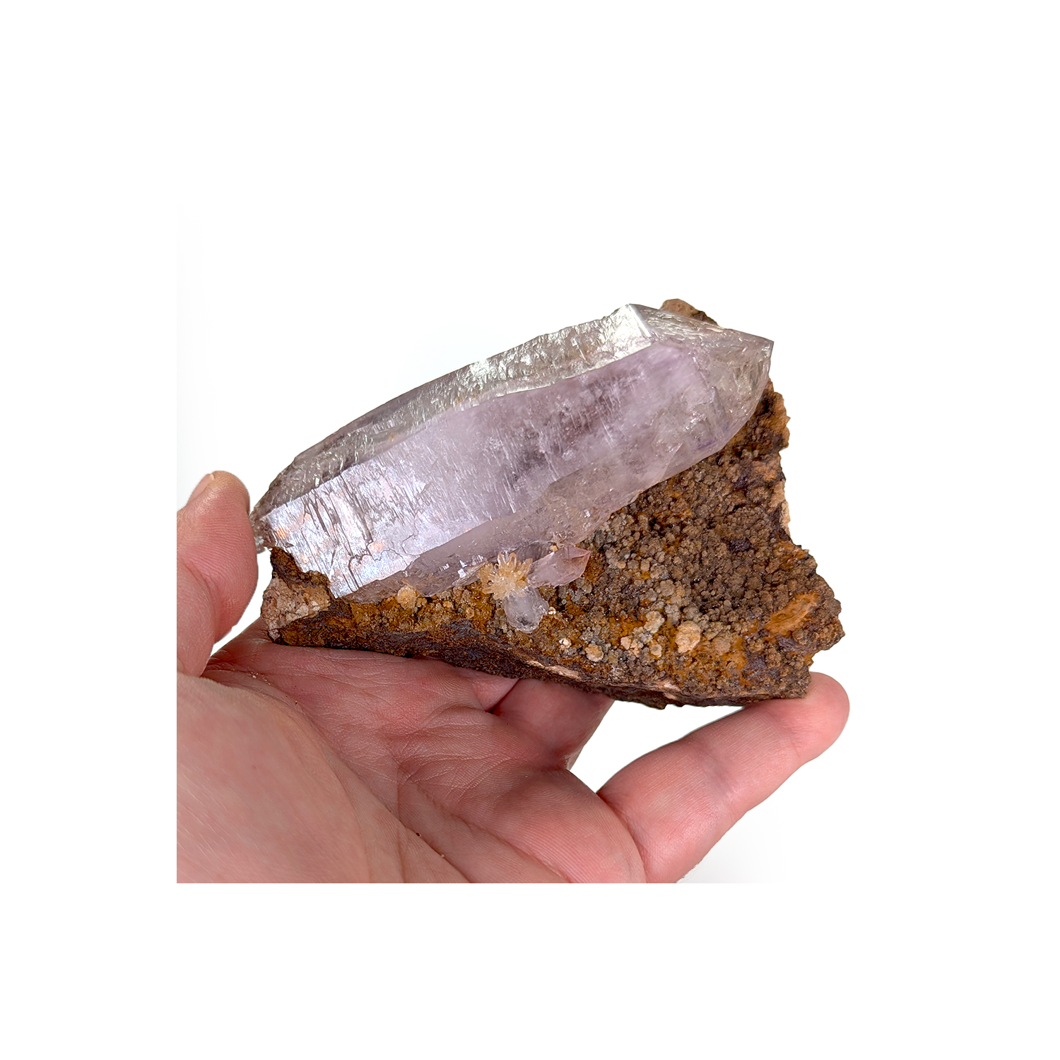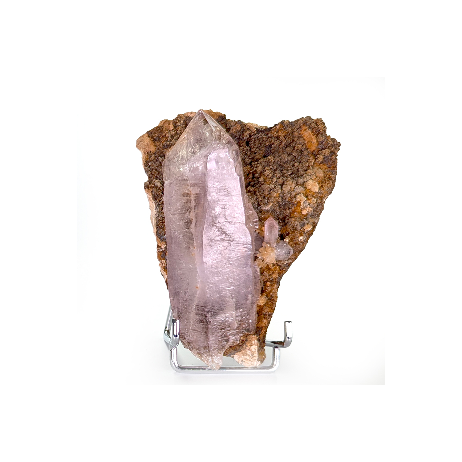Imposing light mauve amethyst crystal on matrix with slightly skeletal growth and reconsolidated fracture marks.