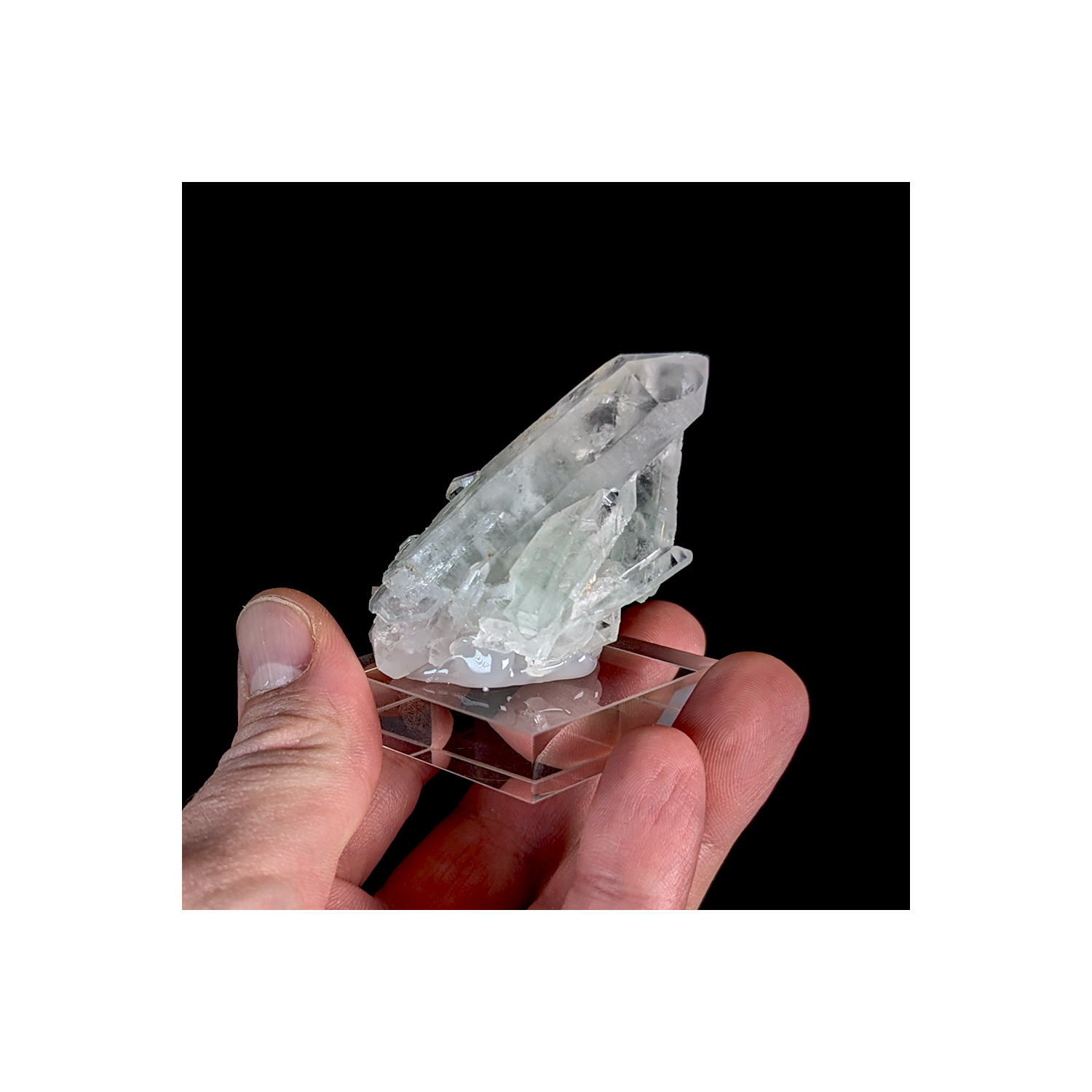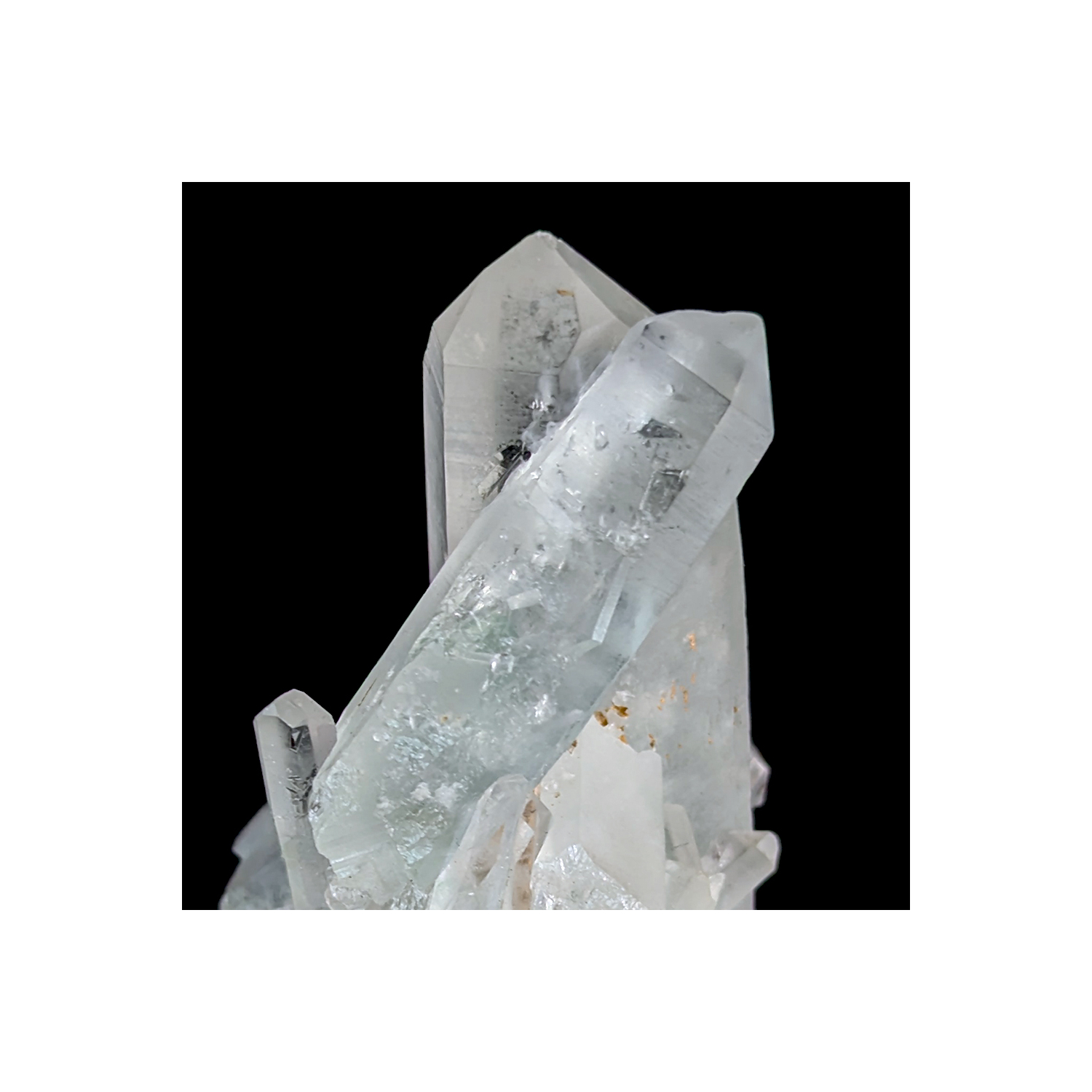 Cluster of quartz crystals with inclusion of fuchsite at the base of the crystals, giving a slight green color to the piece.