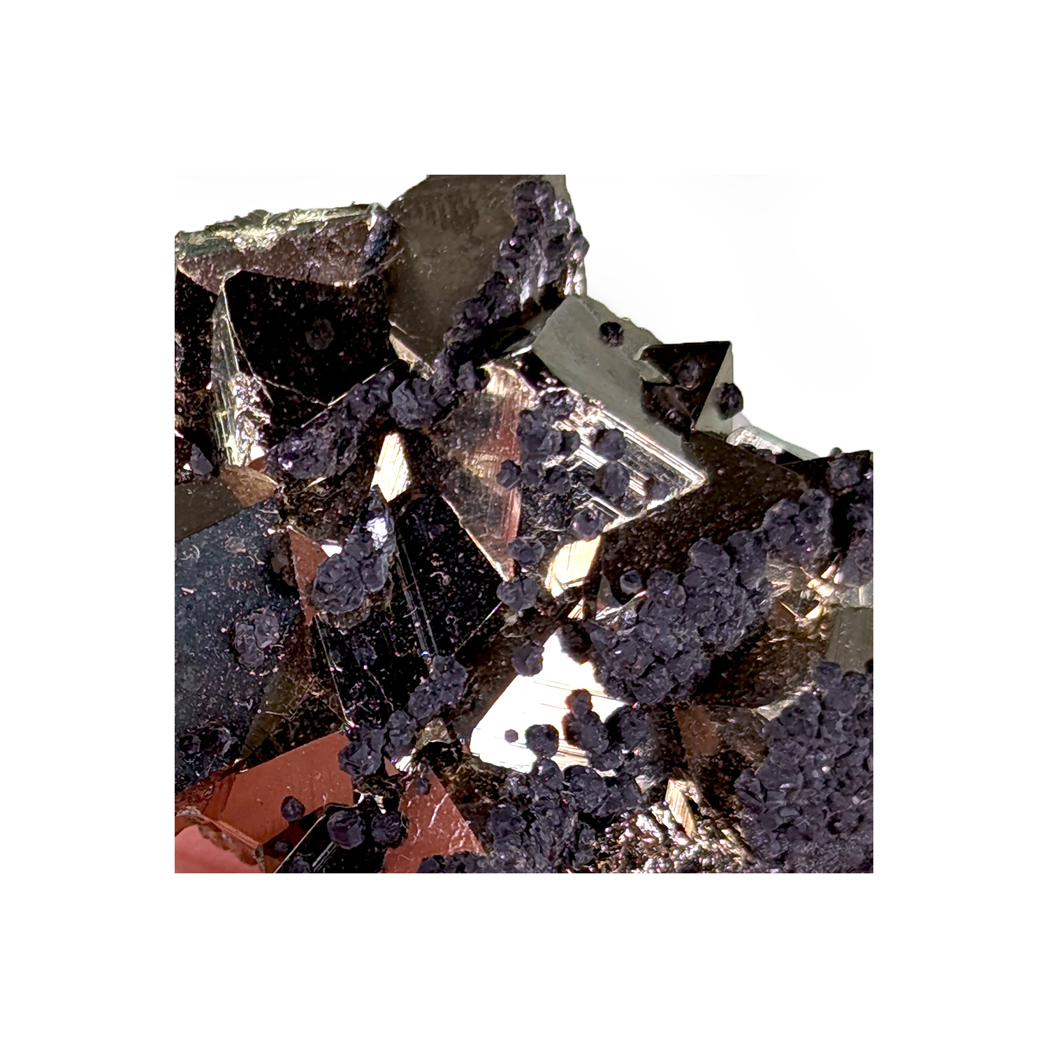 Beautiful, lustrous Peruvian pyrite with octahedral crystals partially covered by black sphalerite.