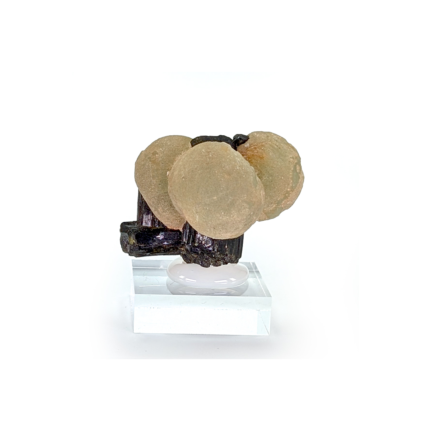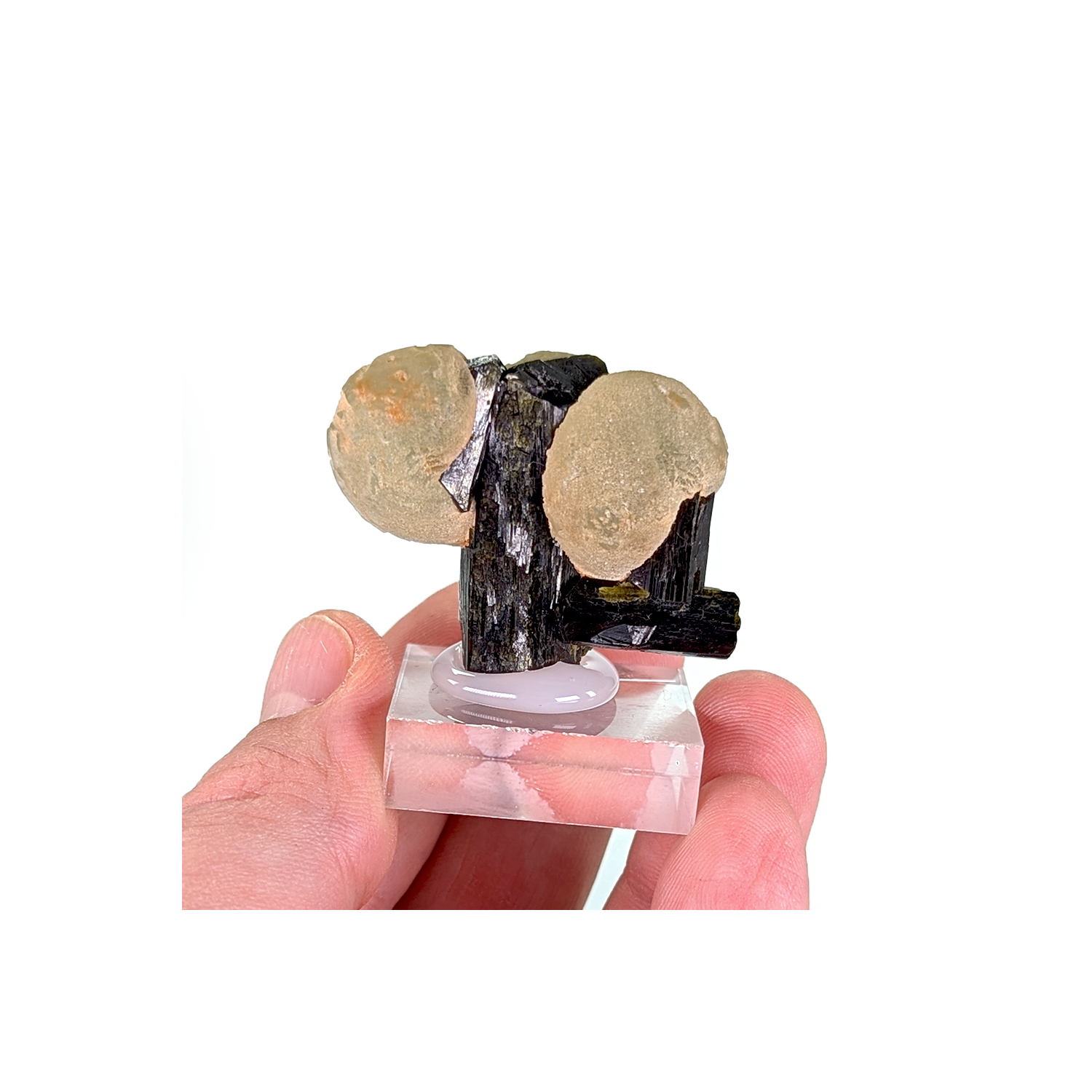 Epidote with three apple-green prehnite spheres on its crystals.