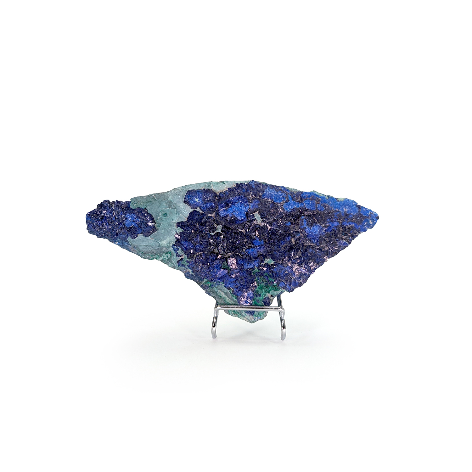 A slab offering a beautiful contrast between a green matrix rich in malachite and a double azurite crystallization displaying two shades of blue.