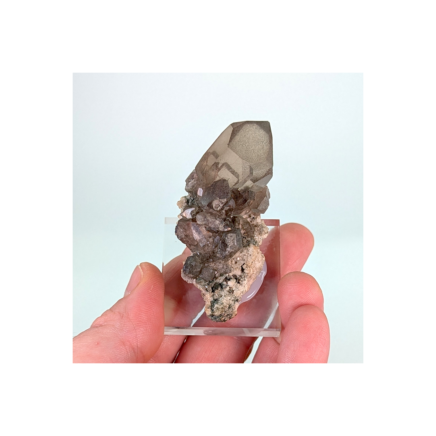 Smoky quartz crystal in perfect condition, with very slightly chlorite-like oxide on the points.